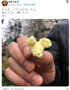 2017年2月に松本人志さんがTwitterで「ディズニーランドに行ってん。ポップコーン買ってん。な!」と投稿し、家族で訪れたことを報告しています。